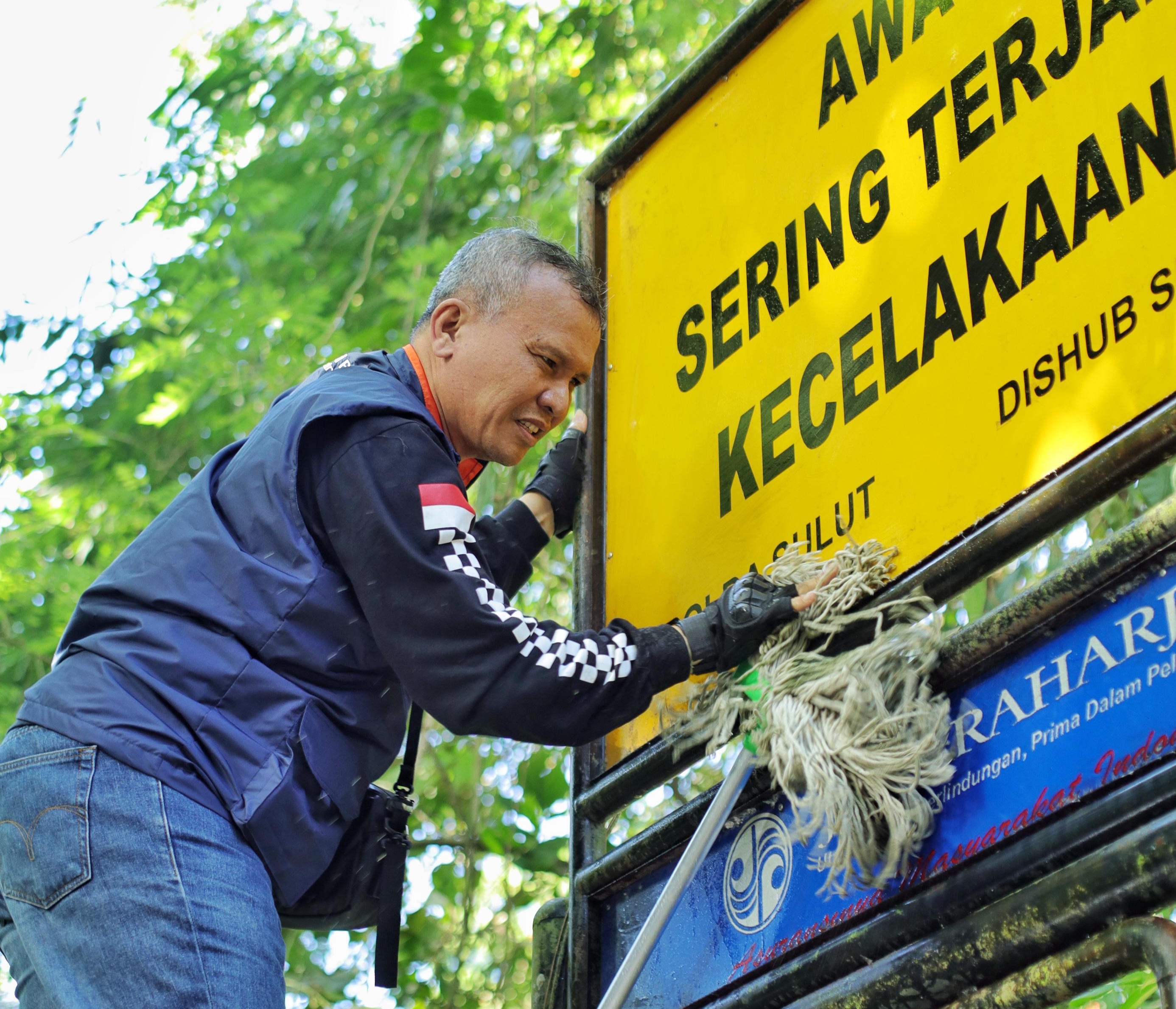 Selain memberikan sosialisasi dan helm gratis, Jasa Raharja dan anggota komunitas melakukan kegiatan pembersihan rambu lalu lintas di Jalan Raya Manado Tomohon, Kelurahan Tinoor, Kecamatan Tomohon Utara, Kota Tomohon, Sulawesi Utara.